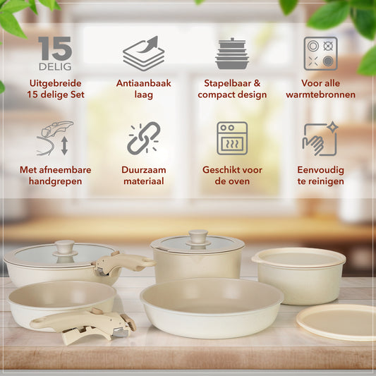 Glissimo Cookware - 21-delige Keramische Pannenset met Inductiebeschermers en RVS Snijplank – Stapelbaar, Afneembare Handgreep, PFAS-vrij, Geschikt voor alle warmtebronnen