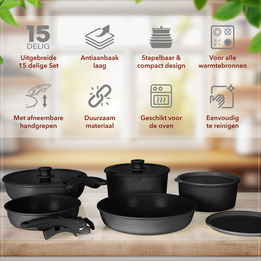 Glissimo 15-delige kookset – Stapelbaar, antiaanbaklaag en inductiegeschikt – PFAS- en BPA-vrij – Ruimtebesparend ontwerp – Zwart