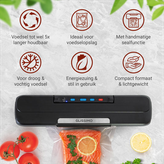 Glissimo – Professionele Vacuümmachine voor Voedsel – Compact & Krachtig – Incl. Afdichtingsfunctie voor Nat en Droog Voedsel – 65kPa – 50x Continu Afdichten - Seal functie - Geschikt voor de meeste vacuumzakken - Vacumeermachine - Noodvoorraad