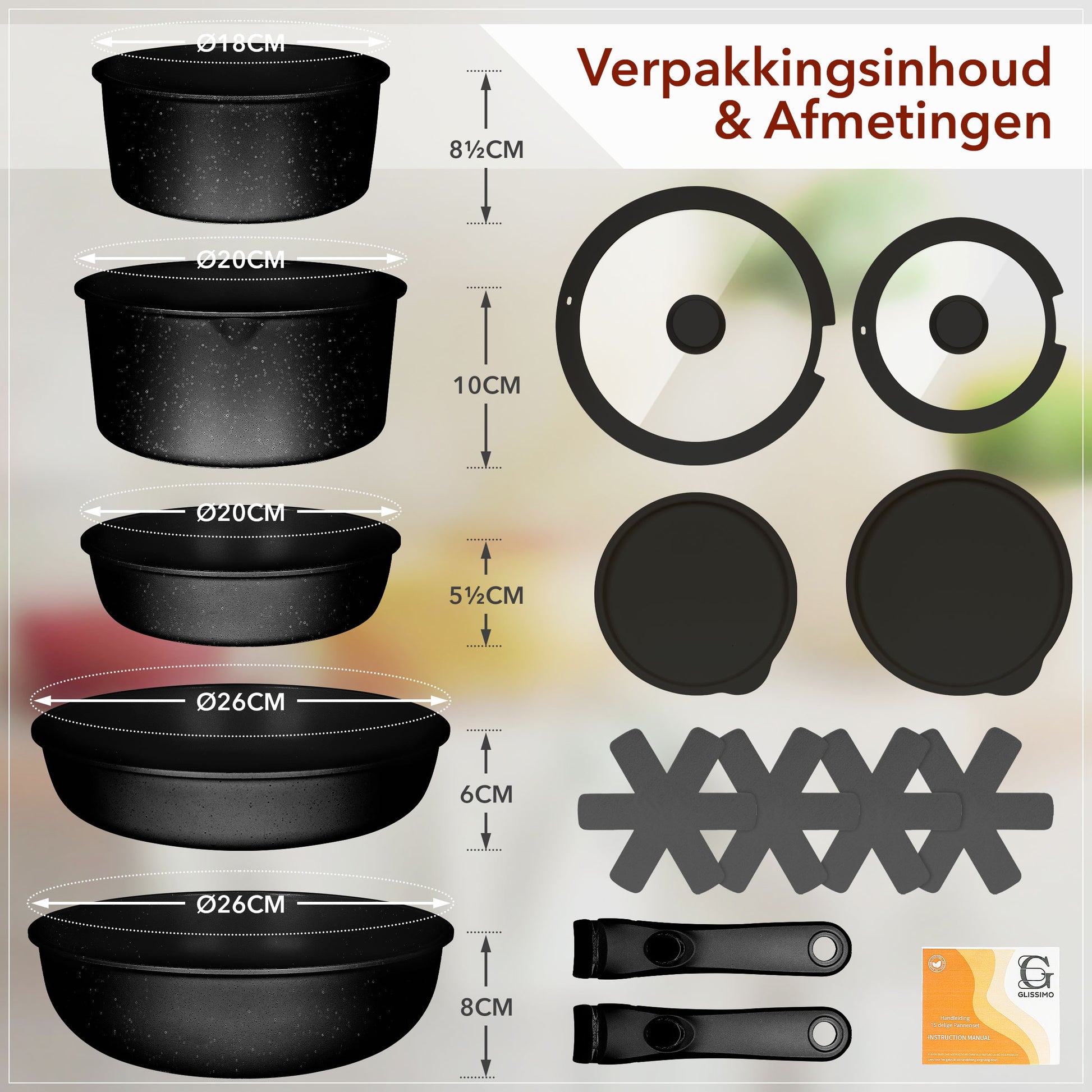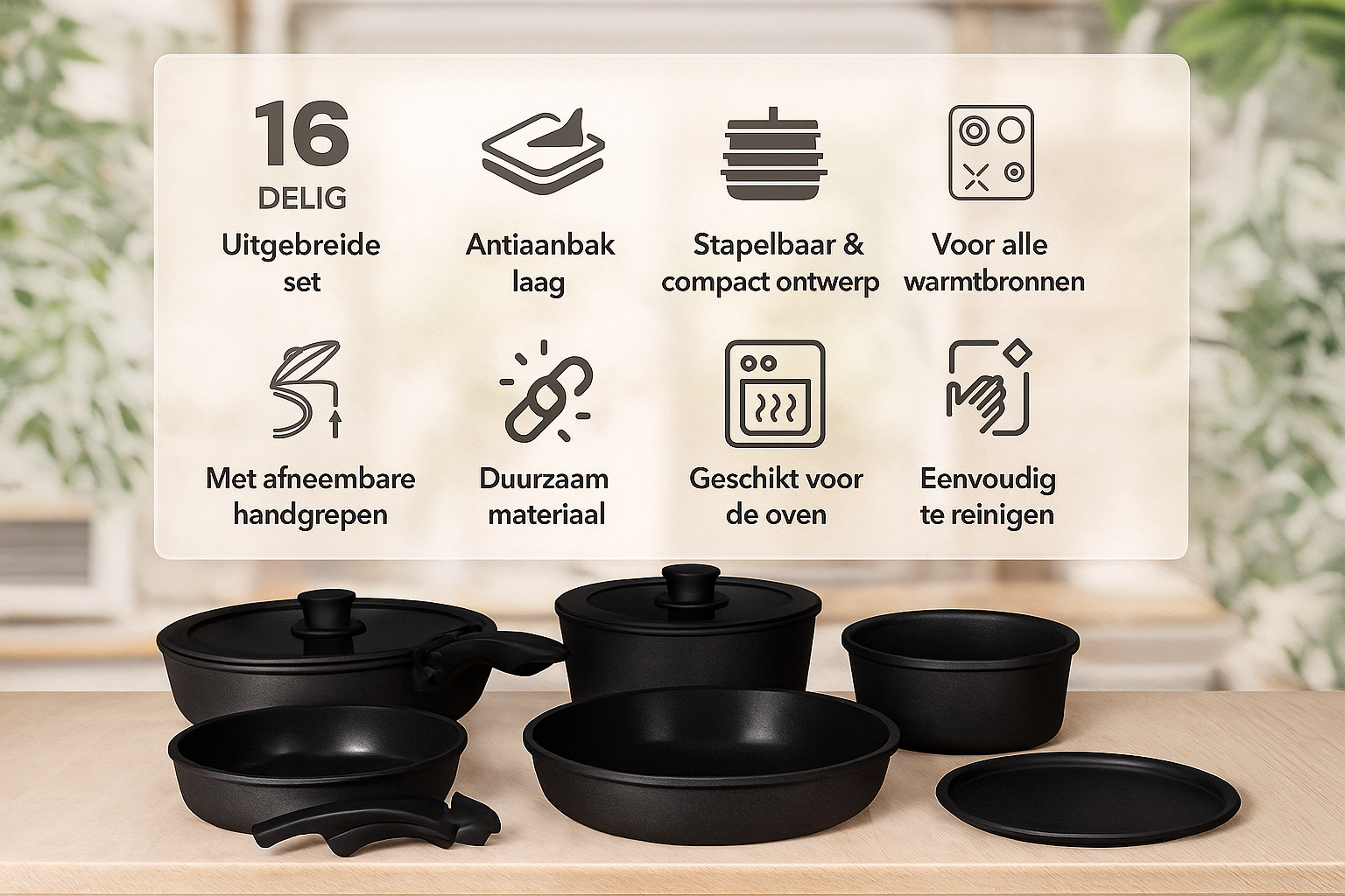 De Glissimo 16-delige pannenset is ontworpen voor de moderne keuken: praktisch, compact en stijlvol. Het duurzame materiaal is bestand tegen dagelijkse slijtage en zorgt voor een gelijkmatige warmteverdeling. Of je nu een beginnende kok bent of een doorgewinterde chef, deze set maakt koken een plezierige en moeiteloze ervaring.